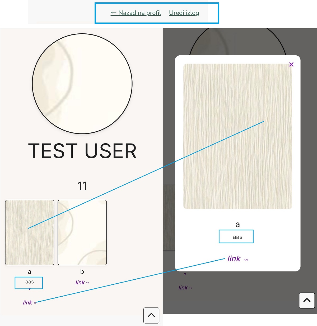 - Klikom na reč „link“ – kako u na samom profilu, tako i na pop-upu, poseticima i tebi se otvara link unet za ovu karticu.