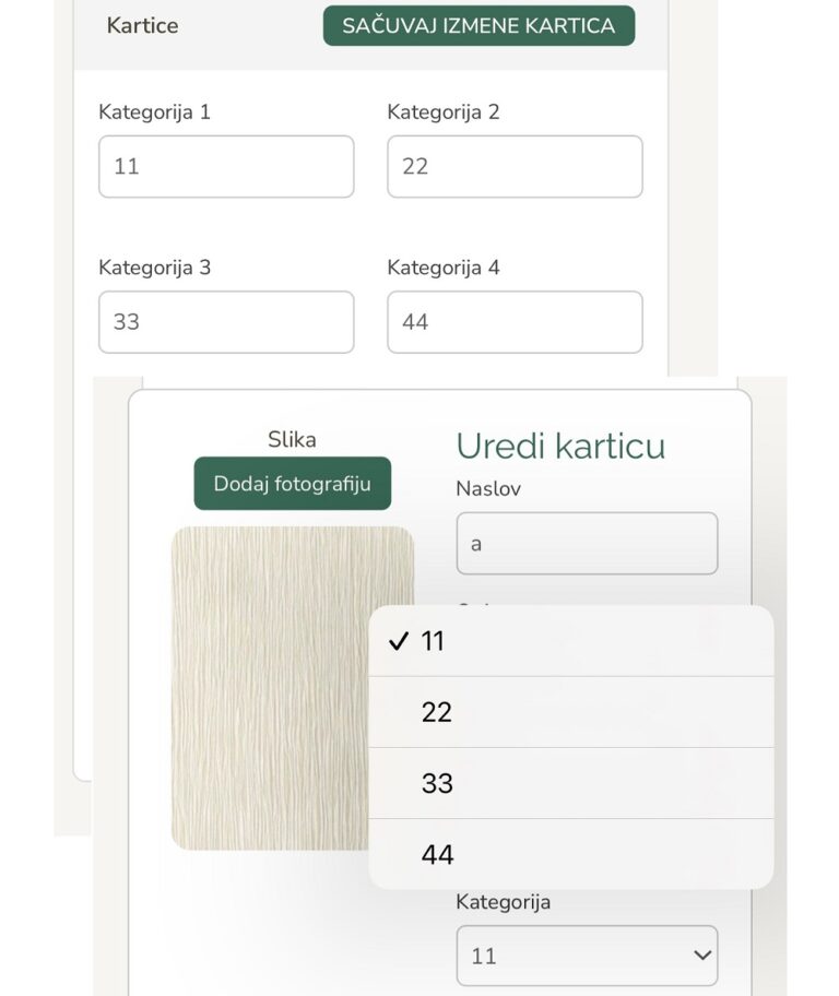 Za svaku karticu koju unosiš moraš da odabereš kategoriju kroz padajući meni. Ako kasnije želiš da karticu prebaciš u neku drugu kategoriju – samo klikni na nju i promeni kroz isti padajući meni.