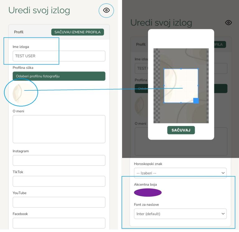 - Sledeće, popuni osnovne podatke: linkove ka društvenim mrežama (Instagram, TikTok, YouTube, X, websajt, eMail, telefon…) – pa i horoskopski znak, ako želiš. Dodaj nekoliko rečenica o sebi (opciono).